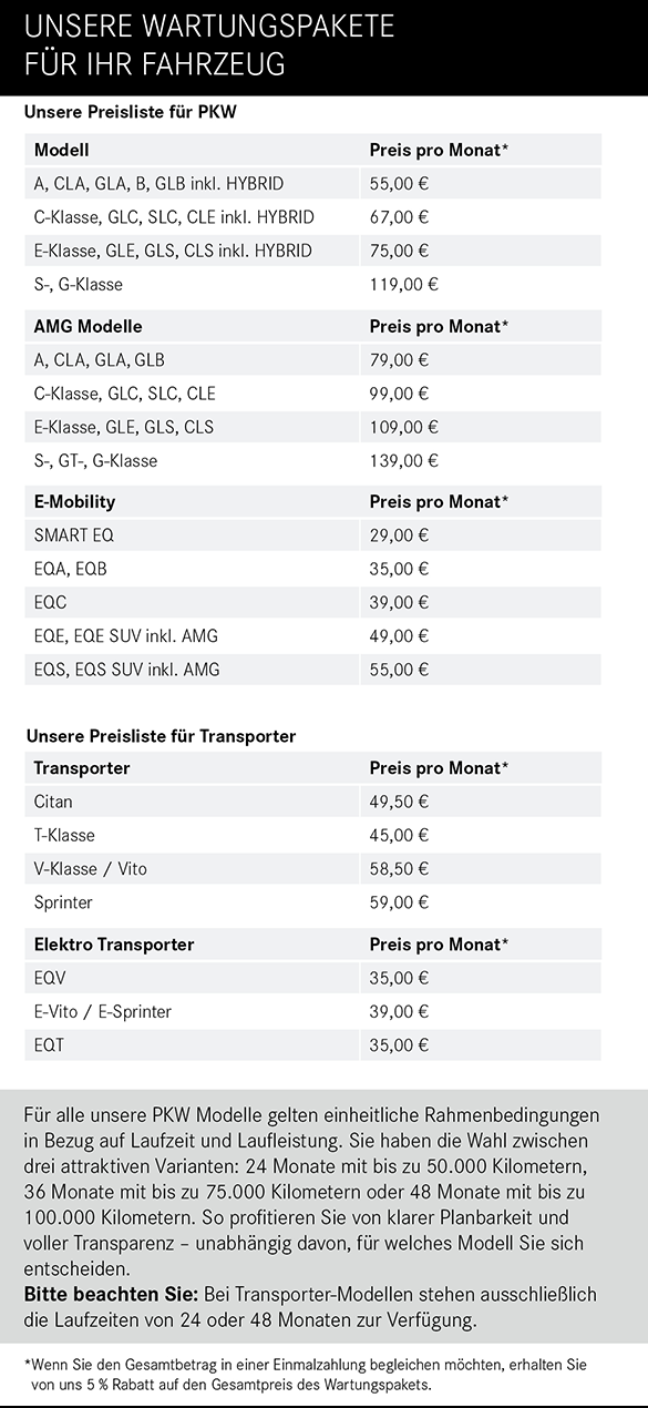 Ob A-Klasse oder EQS, AMG oder GLC – mit den Schmolck Wartungspaketen bleibt Ihr Mercedes in Topform. Fixe Paketpreise, flexible Laufzeiten und umfassender Service sorgen für maximale Sicherheit, Werterhalt und volle Kostenkontrolle.